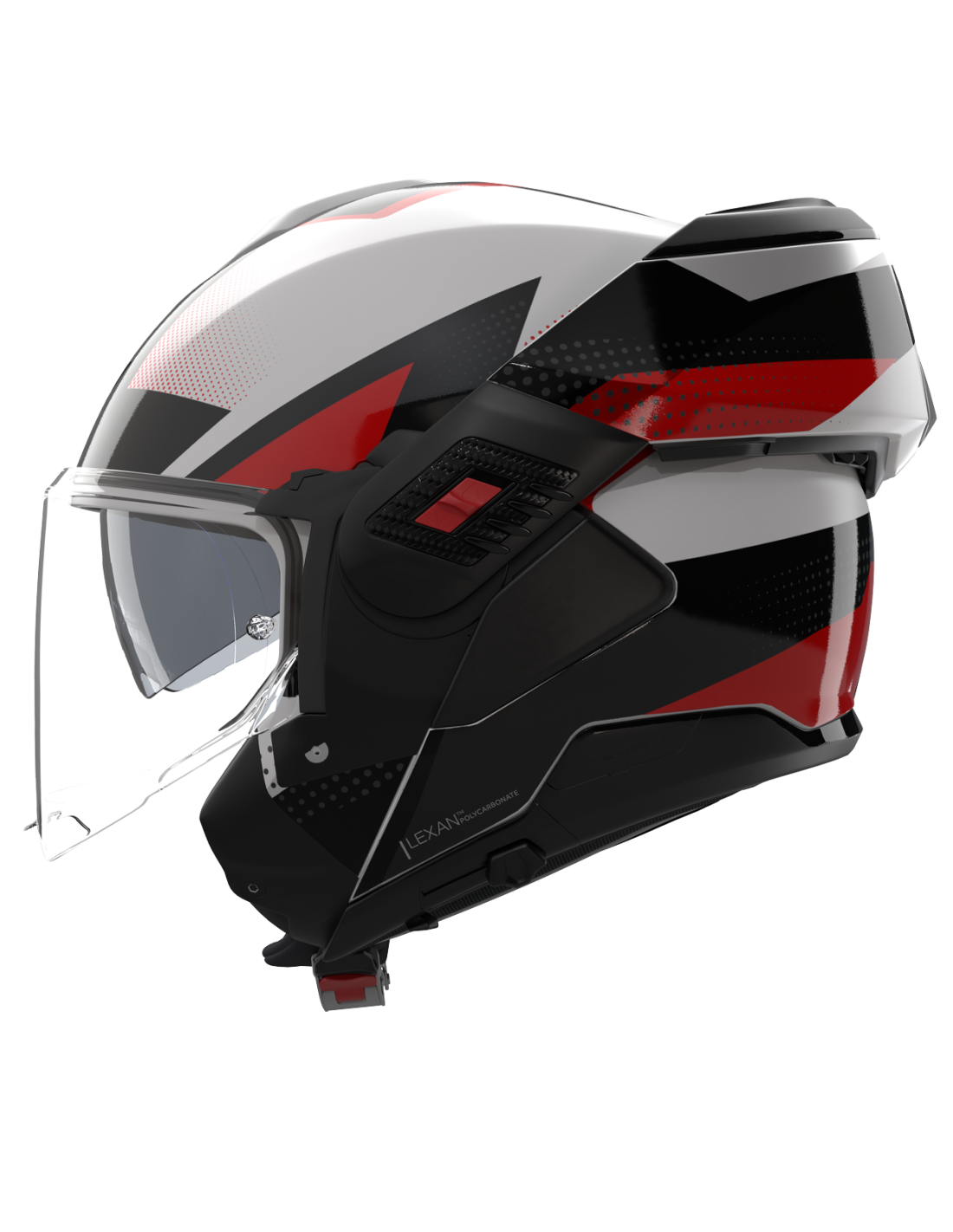 Sredinsko postavljen (rdeč) gumb za sproščanje zaklepa obraznega dela preprečuje naključno odpenjanje in zagotavlja maksimalno stopnjo zaščite. Z lahkoto se ga doseže z obema rokama. Odprt vizir se pri dviganju obraznega dela samodejno zapre.